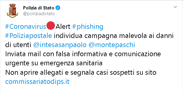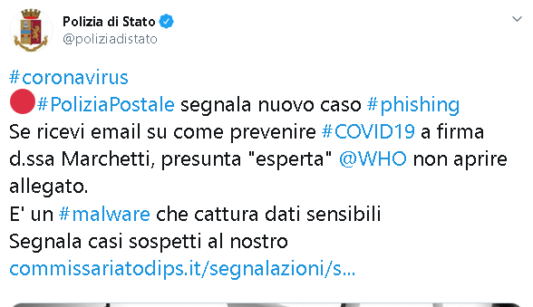 A dimostrazione che le campagne di Spam/Phishing stanno continuando, il profilo Twitter della Polizia di Stato riporta dal giorno 28 febbraio notizie sulle minacce nuove.