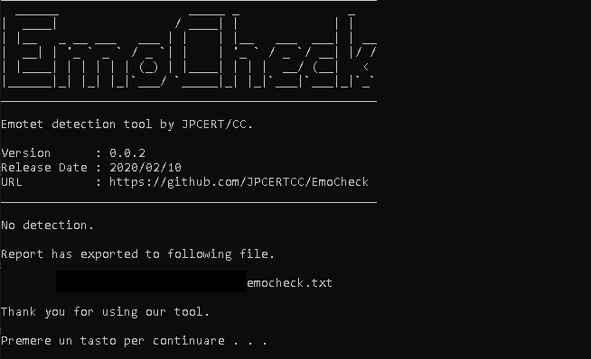 Nota positiva, in Giappone è stato rilasciato uno strumento per rilevare la presenza di Emotet, chiamato Emocheck, rappresentato da un file eseguibile per sistemi a 32 o 64 bit che una volta lanciato ci fa sapere se siamo infetti da Emotet oppure, come si spera, non lo siamo (in tal caso, come nell’immagine, compare “No detection”).