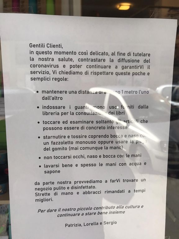 Eppure, anche gli altri esercizi commerciali sono regolarmente aperti. Le serrande tirate su battono di gran lunga quelle chiuse. Il risultato? Tante persone in giro, non solo per "necessità" probabilmente. Tutti i commercianti però, non solo i supermercati, pur non potendo contare su tanti dipendenti, hanno esposto fuori dal loro negozio direttive precise: ingressi consentiti solo a un numero definito di clienti, nessun affollamento e qualche mascherina. I dispositivi di protezione personale sono molti di più della scorsa settimana, sia per strada che nei negozi. La libreria del quartiere ha limitato gli orari, fornisce i guanti in lattice ai clienti per sfogliare i libri ma non si ferma fino a direttive contrarie, perché anche la cultura ha la sua importanza.