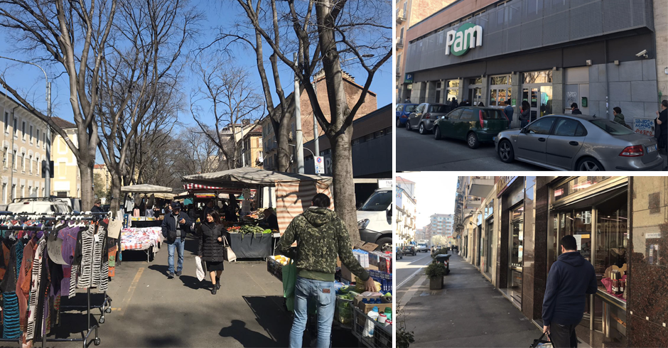 L'invito a stare in casa non è stato recepito da tutti. Anzi. Il via vai è di poco inferiore a un normalissimo giorno lavorativo della settimana. Il mercato di corso Svizzera si presenta piuttosto vivo, sia a livello di banchi presenti che di clienti troppo vicini, intenti a comprare un po' di verdura, di pane o di frutta. Beni necessari e quindi un'uscita consentita. Vale lo stesso per i supermercati della zona: Carrefour, Pam e Crai. Le rispettive direzioni però sono scrupolose nel far rispettare le regole: ingressi limitati per rispettare le distanze, guanti monouso forniti ai clienti e sicurezza a gestire gli ingressi o a dare indicazioni. Tutto si svolge nel pieno rispetto del decreto firmato dal premier Conte.