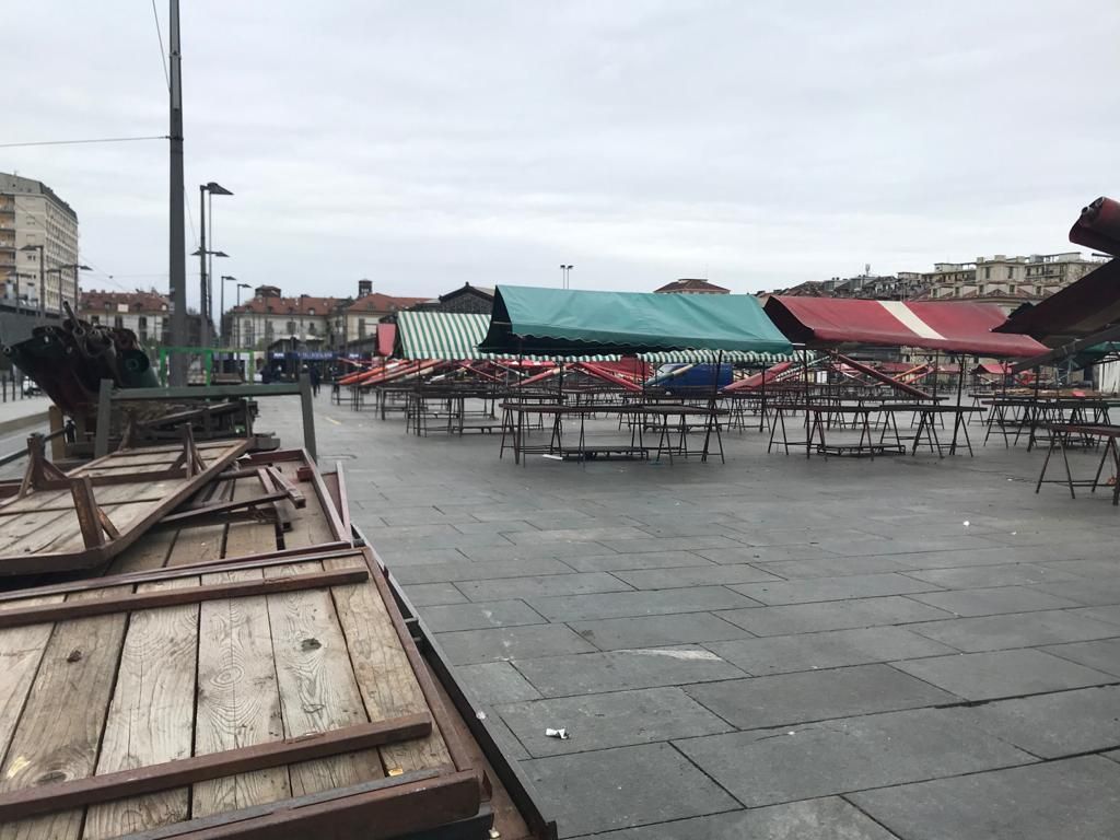 Un silenzio irreale, gli scheletri delle bancarelle e qualche persona spaesata in giro. Non è un lunedì come gli altri in piazza della Repubblica: il Coronavirus ha fermato il mercato di Porta Palazzo. Il luogo di Torino che ogni mattina è sinonimo di vita e caos, è oggi un luogo spettrale e irriconoscibile.