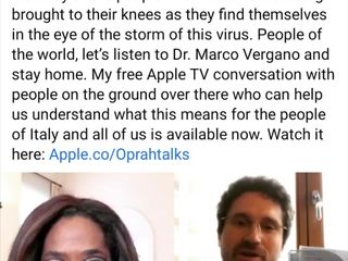 La celebre conduttrice americana Oprah Winfrey, grande estimatrice del nostro Paese, ha intervistato qualche giorno fa a proposito del Covid-19 il medico Marco Vergano, astigiano, anestesista rianimatore all'ospedale San Giovanni Bosco di Torino, per far capire al mondo intero l’emergenza sanitaria che il paese sta vivendo.