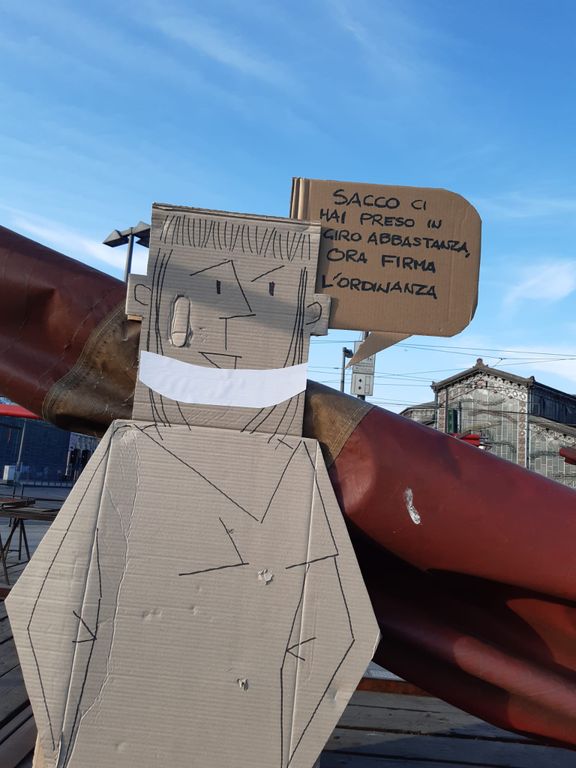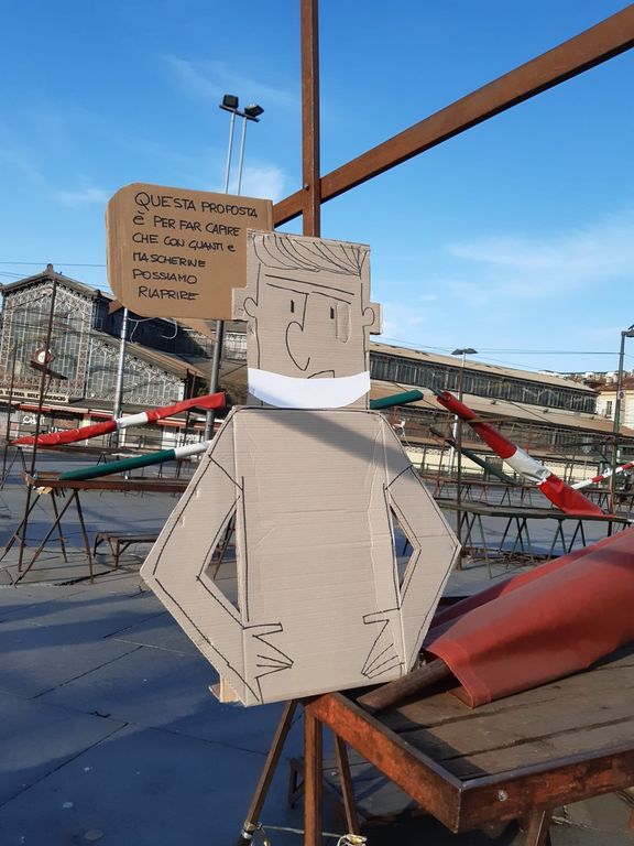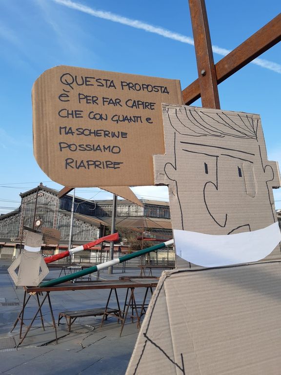 Prosegue in forma alternativa la mobilitazione di chi vorrebbe la riapertura del mercato in sicurezza: gli operatori, rappresentati da sagome di cartone, gridano simbolicamente slogan di protesta