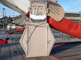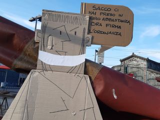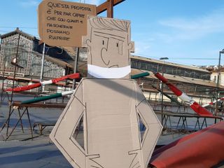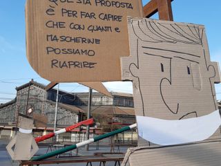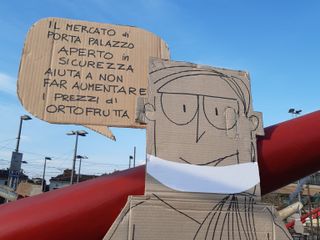 Prosegue in forma alternativa la mobilitazione di chi vorrebbe la riapertura del mercato in sicurezza: gli operatori, rappresentati da sagome di cartone, gridano simbolicamente slogan di protesta