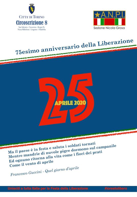 Sarà un 25 aprile senza piazze gremite e festeggiamenti pubblici, ma la Circoscrizione 8 di Torino non mancherà di celebrarlo, come sempre, con partecipazione. È stata lanciata proprio ieri un’iniziativa congiunta con Anpi per il 75° anniversario della Liberazione, siglata da un manifesto speciale - da diffondere sul web, anziché affiggerlo nel quartiere -, che reca in calce i versi di Quel giorno d’aprile, firmata Francesco Guccini: "Ma il paese è in festa e saluta i soldati tornati/Mentre mandrie di nuvole pigre dormono sul campanile/Ed ognuno ritorna alla vita come i fiori dei prati/Come il vento di aprile”.