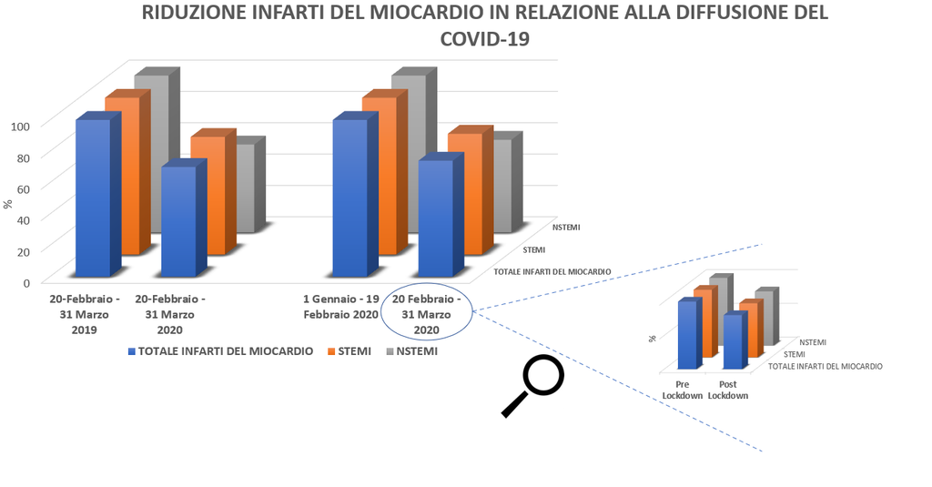 È stata elaborata un’analisi retrospettiva delle caratteristiche cliniche e angiografiche dei pazienti ricoverati per SCA in 15 ospedali del nord Italia, tutte strutture attrezzate per eseguire operazioni come l’intervento coronarico percutaneo. Il periodo in cui si è svolto lo studio è compreso tra il primo caso accertato di Covid-19 in Italia (20 febbraio 2020) e il 31 marzo 2020. Sono stati paragonati i tassi di ricovero tra il periodo di studio appena citato e altri due periodi: quello corrispondente all’anno precedente (20 febbraio – 31 marzo 2019) e un periodo immediatamente precedente a quello oggetto della ricerca (primo gennaio – 19 febbraio 2020).