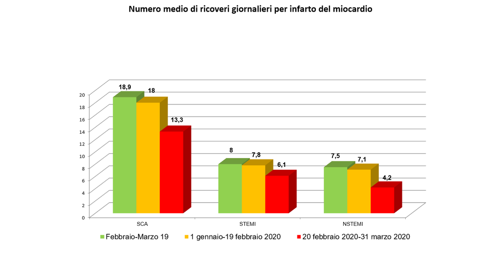 Il principale risultato ottenuto è relativo al tasso globale di ricoveri per SCA. Tale risultato è stato ottenuto dividendo il numero complessivo dei ricoveri con il numero di giorni di ogni periodo di tempo. I rapporti di incidenza sono stati calcolati usando la Regressione di Poisson. Dei 547 pazienti ricoverati per SCA durante il periodo di studio, 420 (76,8%) erano uomini, con un’età media tra i 56 e gli 80 anni. Di questi pazienti 248 (45,3%) presentavano un infarto miocardico con sopraslivellamento del tratto ST. Il tasso di ricoveri per SCA durante il periodo di studio è stato di 13,1 ricoveri al giorno. Questo valore era notevolmente più basso, circa un terzo, sia rispetto al periodo precedente (dal primo gennaio al 19 febbraio 2020: 18 ricoveri al giorno) sia rispetto allo stesso periodo ma dell’anno precedente (dal 20 febbraio al 31 marzo 2019: 18,9 ricoveri al giorno). La riduzione era ancora più marcata considerando il solo periodo del lock-down di marzo o considerando solo gli infarti e non l’angina instabile.