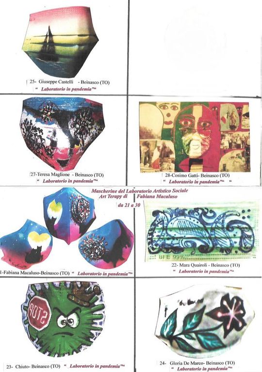 Il Laboratorio Artistico Sociale Art- Therapy guidato da Macaluso Fabiana, con sede presso l’associazione Marletti in Beinasco a Torino, partecipa alla mostra “Mascherina D’Artista” ideata dall’Artista Gianni Ottaviani di Milano che con la riproduzione fotografica delle Mascherine D’Artista realizzate dagli artisti e non le esporrà in mostre in varie sedi  dopo il termine della Pandemia con la collaborazione di Eugenio Costa titolare della casa editrice Milanese Montabone editore che realizzerà sia un catalogo con riproduzione di tutte le Mascherine sia con la messa in rete dello stesso sfogliabile.