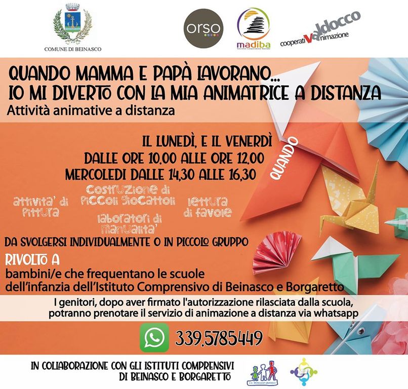 - “Quando mamma e papà lavorano.. io mi diverto con la mia animatrice a distanza”: attività animative a distanza rivolto a bambini/e che frequentano le scuole dell’infanzia degli Istituti Comprensivi di Beinasco e Borgaretto (lunedì e venerdì dalle ore 10 alle 12, il mercoledì dalle 14,30 alle 16,30);