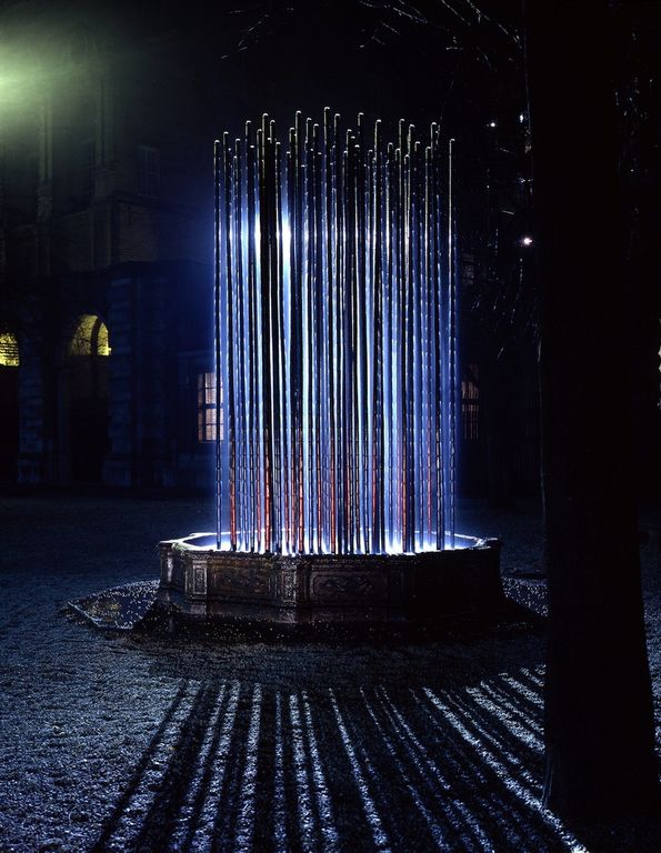 Le 56 canne da cui zampilla l’acqua, simili ai sottili fusti del bambù e alte cinque metri, sono dipinte in blu e rosso e sono state realizzate in alluminio anodizzato con la sofisticata tecnologia del “polistirene perduto” (lost foam) che riprende in chiave contemporanea l’antico metodo della “cera perduta”, utilizzato per produrre le statue in bronzo.
