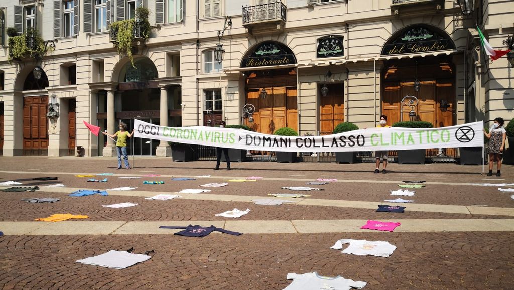 "Oggi Coronavirus > Domani Collasso Climatico". È questo la scritta sullo striscione esposto questa mattina dagli Extinction Rebellion Torino, che questa mattina davanti a Palazzo Carignano hanno dato il via al primo flash mob ambientale post lockdown.