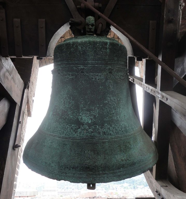 La campana, che misura 106 cm di altezza e 365 cm di diametro alla bocca, fu pagata il 6 maggio 1670 550 lire. Su di essa compare l’iscrizione: «AD VSVM HORARII REGIAE CAROLVS EMANVEL II SABAVDIAE DVX PEDE·MONTIVM PRINCEPS CYPRI REX PROPRIO SVMPTA (sic, leggasi SVMPTV) FVNDI IVSSIT ANNO SAL. MDCLXX». Segue l'indicazione del peso in rubbi: «R. 125.20» e la firma: «SIMON BOVCHERON MA FAITE». Sono inoltre presenti le armi ducali di Savoia e festoni con teste di putti alati. Nella parte superiore il manico o ansa (parte a cui si fissa il mozzo di sostegno della campana) è formato da sei mascheroni.