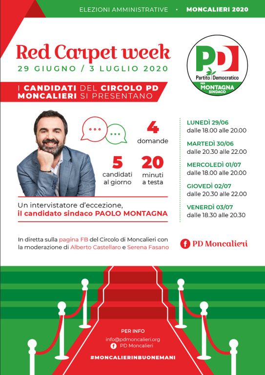 La campagna elettorale cambia le sue tradizioni consolidate, in epoca di coronavirus (e di crescente importanza dei social). Così, in vista del voto amministrativo d'autunno, il Pd di Moncalieri ha deciso di lanciare il "red carpet virtuale” su Facebook per far conoscere i suoi 23 candidati.