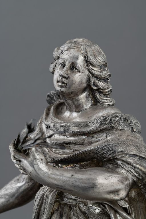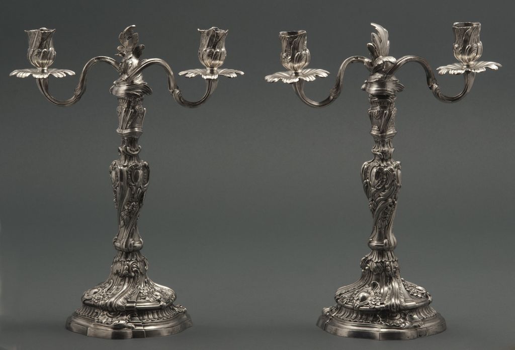 Agli argenti da tavola seguono gli oggetti da arredo, come i candelieri, con una bella coppia di doppieri su cui è apposto il punzone del mastro argentiere Carlo Bartolomeo Minutto.