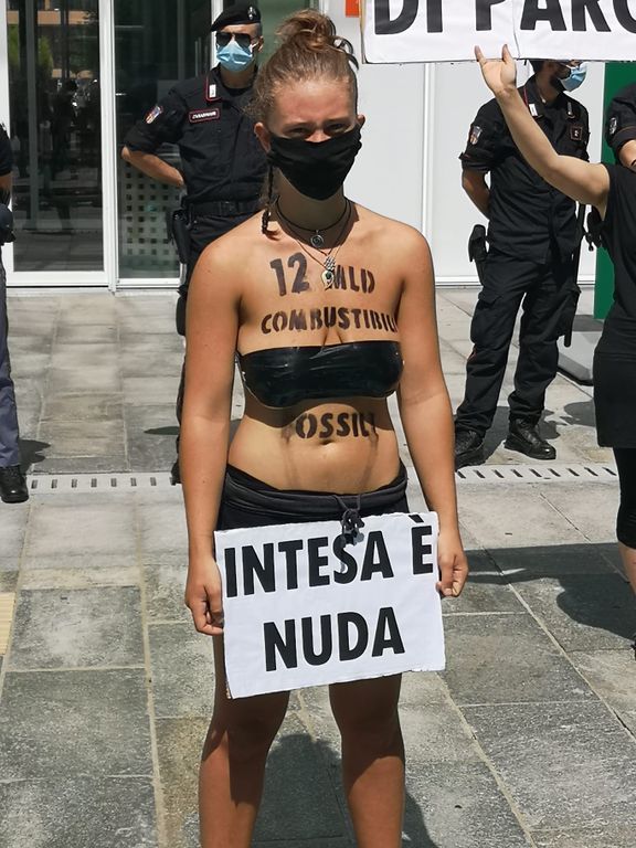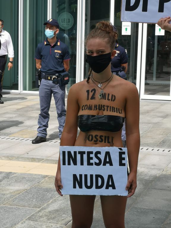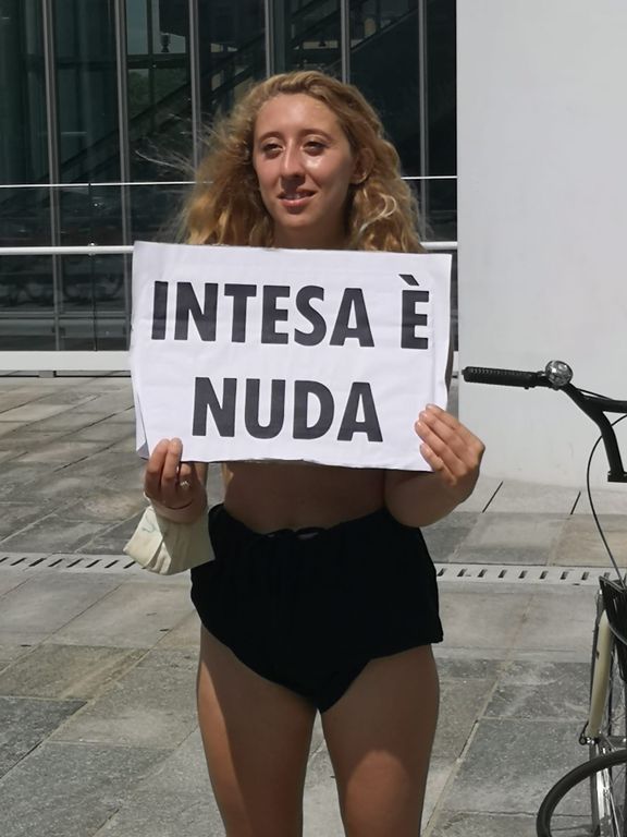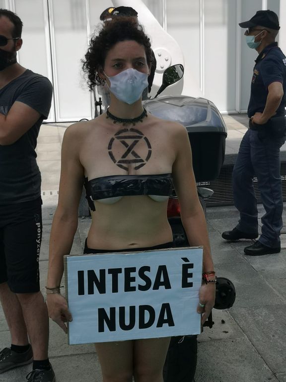 "Intesa è nuda": gli attivisti di Extinction Rebellion si spogliano simbolicamente davanti al grattacielo [FOTO E VIDEO]