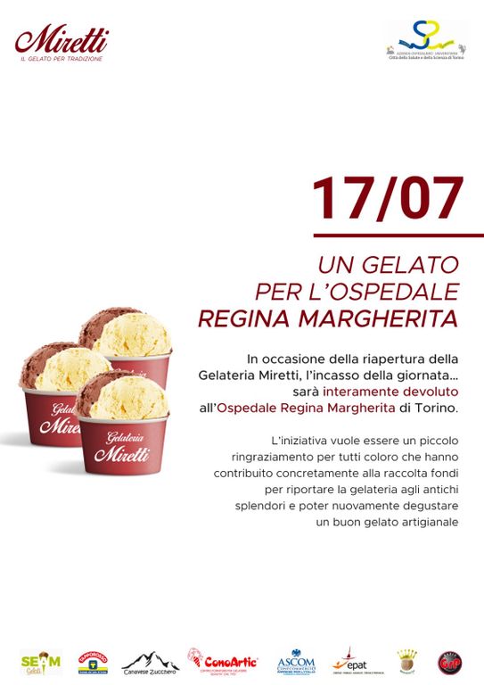 Venerdì 17 luglio la gelateria Miretti ha deciso una iniziativa benefica a favore dei bambini del noto ospedale torinese: l'incasso dell'intera giornata, infatti, sarà devoluto al Regina Margherita.