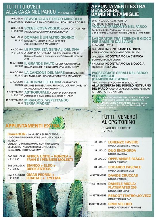 Alla Casa nel Parco verranno proposti 9 appuntamenti, un concerto, cinema sotto le stelle e conferenze scientifiche divulgative, tutti i giovedì sera, dal 16 luglio con il concerto di musica lirica e gospel di Fé Avouglan e Diego Mingolla fino al 10 settembre con l’evento “Aspettando Terra Madre” della Comunità Slow Food - Mirafood per la valorizzazione del quartiere Mirafiori Sud di Torino. Tutti gli eventi alla Casa nel Parco sono con ingresso a offerta libera e prenotazione obbligatoria.