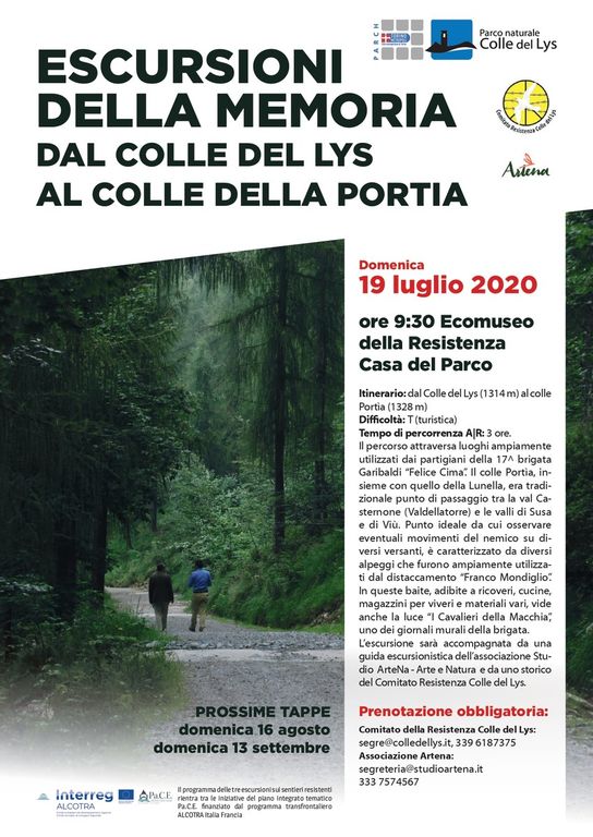 La prima escursione della memoria è domenica 19 luglio, nel tratto fra il Colle del Lys e il Colla della Portia, circa tre ore (andata e ritorno) a poco più di 1.300 metri di quota per attraversare il percorso utilizzato dai partigiani della 17^ brigata Garibaldi “Felice Cima”.