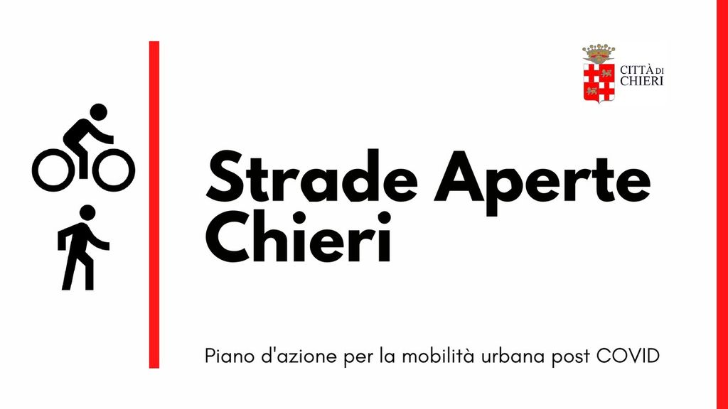 “STRADE APERTE A CHIERI” è il Piano d’azione per la mobilità urbana post COVID-19 adottato dall’amministrazione comunale per ripensare la città, gli spazi e la mobilità urbana, accelerando l’adozione di forme di mobilità sostenibile, ampliando gli spazi pedonali e ciclabili, garantendo la sicurezza di chi si sposta a piedi, in bici, con e-bike, con forme di micromobilità e per le persone con disabilità.