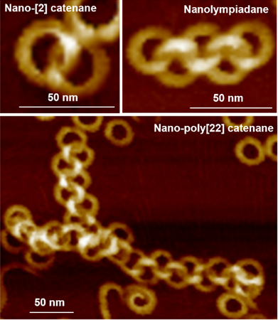 Immagini AFM di un nano-[2]catenano, un nano-[5]catenano and un nano-poli[22]catenano.Nel 2016, il premio Nobel per la chimica (per il contributo alla sintesi di macchine molecolari) è stato assegnato a Ben Feringa, Fraser Stoddart e a Jean-Pierre Sauvage, quest’ultimo per essere riuscito a collegare due molecole a forma di anello in quello che viene chiamato un "catenano". A differenza dei normali polimeri, composti da monomeri interconnessi tramite legami chimici covalenti, i catenani sono formati da unità interconnesse tra di loro come anelli di una catena (mechanically interlocked). Ciò consente agli anelli di muoversi l'uno rispetto all'altro, conferendo a questi materiali proprietà uniche in termini ad esempio di assorbimento, conversione e dissipazione di energia, di super-elasticità, ecc.