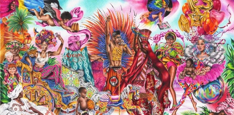 Il tema scelto quest’anno da Flashback, l’arte è tutta contemporanea è Ludens, ispirato al racconto di fantascienza La variante dell’Unicorno di Roger Zelazny e all’opera di Johan Huizinga: il gioco dunque inteso come fondamento della vita umana e della creatività, come approccio fondamentale per la ricostruzione continua del mondo e come attività sacra, viene declinato dall’artista in un tripudio di colori, personaggi, suoni e azioni che trasfigurano completamente la fonte visiva tratta dalla storia dell’arte, un dettaglio dalla decorazione di Palazzo Farnese realizzata da Annibale Carracci (1597-1607), reinterpretandola, attualizzandola e consegnandola alla nostra contemporaneità così difficile e interessante.
