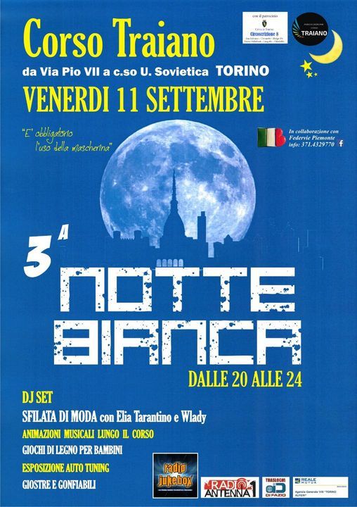 E' di nuovo tempo di Notte Bianca, in corso Traiano. Dopo il successo delle scorse edizioni, l'evento che da sempre ravviva il cuore commerciale del quartiere Lingotto ritorna venerdì 11 settembre dalle 19 a mezzanotte, patrocinato dalla Circoscrizione 8 e in collaborazione con Federvie Piemonte.