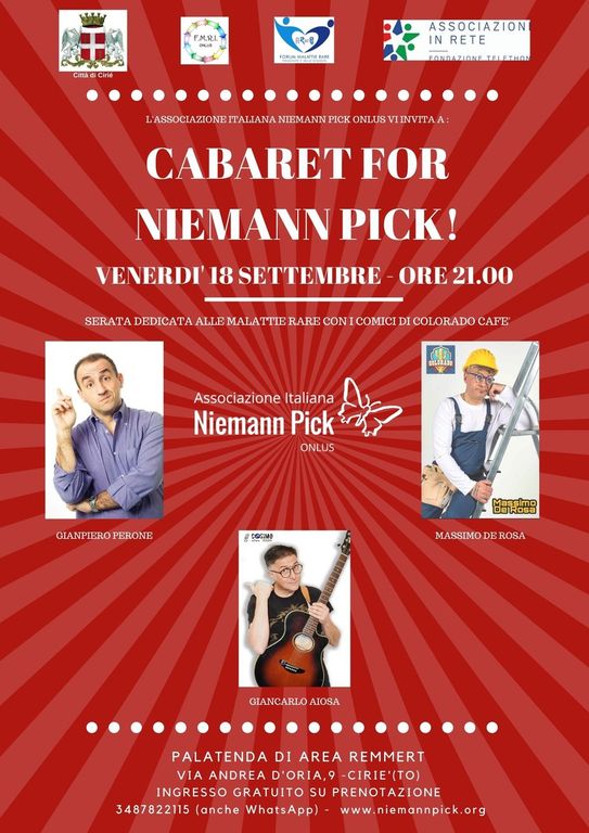 Venerdì 18 settembre alle ore 21.00 presso il Palatenda di Area Remmert in via Andrea D’Oria, 9 a Cirié (TO) avrà luogo lo spettacolo “Cabaret for Niemann Pick!” con i comici di “Colorado Café” dedicato all’Associazione Italiana Niemann Pick Onlus di Cirié (TO).
