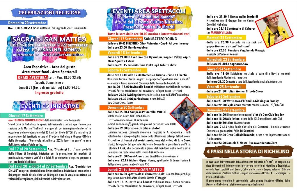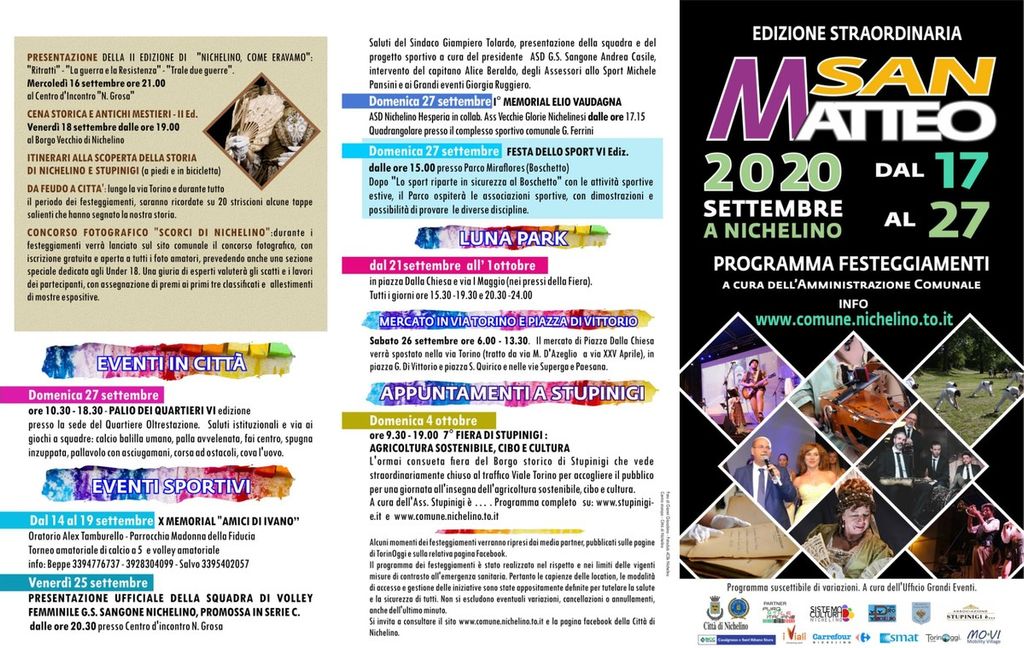 Qualche settimana fa era stata in forse, si era ventilata l'ipotesi di una edizione in formato ridotto, ed invece anche quest'anno la festa di San Matteo animerà la città di Nichelino per dieci giorni, con eventi, spettacoli, momenti religiosi e sportivi, la fiera, oltre al classico appuntamento con il luna park.