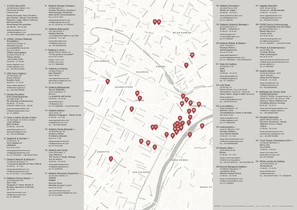 Questa le altre gallerie partecipanti: Crag-Chiono Reisovà Art Gallery, Csa Farm Gallery, Davide Paludetto Arte Contemporanea, Febo e Dafne Studio d’Arte, Gagliardi & Domke, Galleria Umberto Benappi, Galleria Biasutti & Biasutti, Galleria Franco Noero, Galleria Giorgio Persano, Galleria Gliacrobati, Galleria In Arco, Galleria La Rocca, Galleria Malinpesa by La Telaccia, Galleria Moitre, Galleria Peola Simondi, Galleria del Ponte, Galleria Riccardo Costantini, Galleria Roccatre, Galleria Weber & Weber, Galo Art Gallery, Just Goat, Luce Gallery, Metroquadro, Mucho Mas, Norma Mangione Gallery, Oggetti Specifici, Phos Centro polifunzionale per la fotografia e le arti visive, Photo&Contemporary, Quartz Studio, Raffaella de Chirico Arte Contemporanea, Société Interludio, Tucci Russo Chambres d’Art.