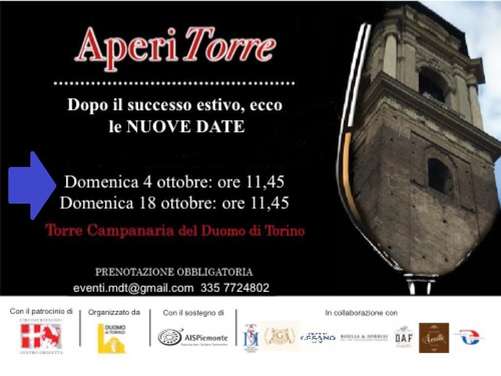 Nonostante il periodo difficile che stiamo attraversando e grazie alla volontà di alcuni parrocchiani, il Duomo di Torino ha deciso coraggiosamente di organizzare nei mesi estivi una serie di eventi chiamati AperiTorre. Si tratta di un aperitivo di qualità accompagnato da uno sguardo dall’alto sulla storia bimillenaria della nostra Città.