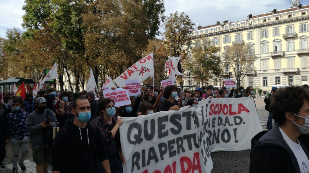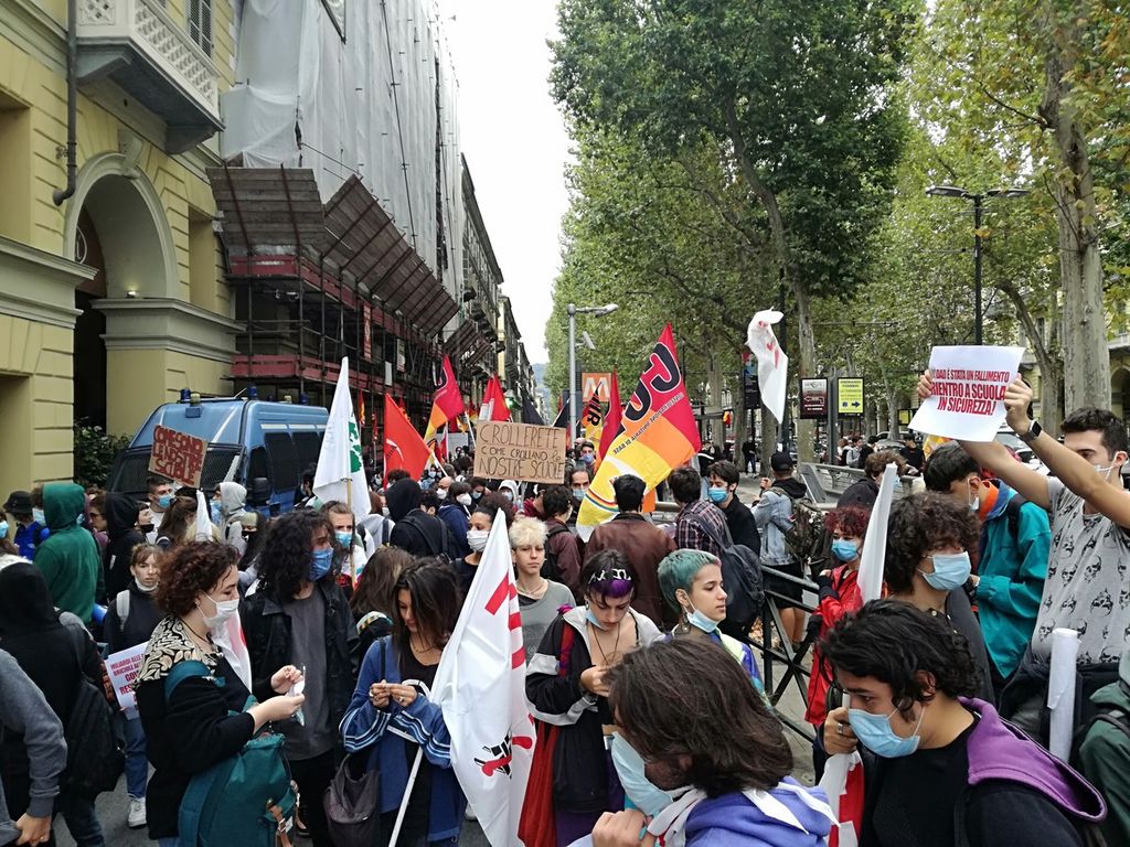 "Aprono le scuole senza professori / Azzolina dimissioni". Cub Scuola e Fridays for Future per una manifestazione "di gruppo", questa mattina, di fronte alla sede del MIUR in corso Vittorio Emanuele II. Con loro anche alcune bandiere No Tav e riferimenti al movimento del Black Lives Matter.