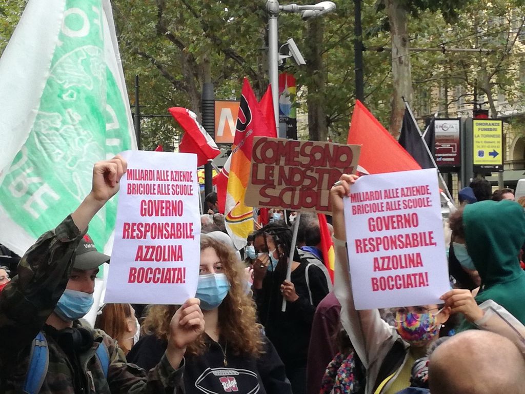 Il copione è quello collaudato: musica sparata ad alto volume dagli amplificatori, slogan scanditi dai megafoni e controviale bloccato dalle forze dell'ordine. E se i ragazzi seguaci di Greta mettono nel mirino la collaborazione del mondo della scuola con Eni, colpevole secondo loro di parte dell'inquinamento del pianeta, i sindacati di base protestano "insieme ai colleghi dei servizi educativi comunali per denunciare le criticità dei servizi pubblici rivolti all'infanzia e ai nostri giovani: poco personale, scuole fatiscenti, classi "pollaio" ma soprattutto un numero impressionante di lavoratori precari, chiamati in servizio cronicamente in ritardo, ad anno scolastico già avviato".
