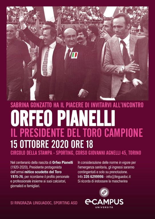 Linguadoc/eCampus, grazie alla passione e alla competenza di Sabrina Gonzatto, ha deciso di organizzare una serata evento per ricordare "Orfeo Pianelli, il presidente del Toro campione", che si svolgerà domani, giovedì 15 ottobre, alle ore 18, presso il Circolo della Stampa-Sporting di corso Agnelli 45 a Torino.