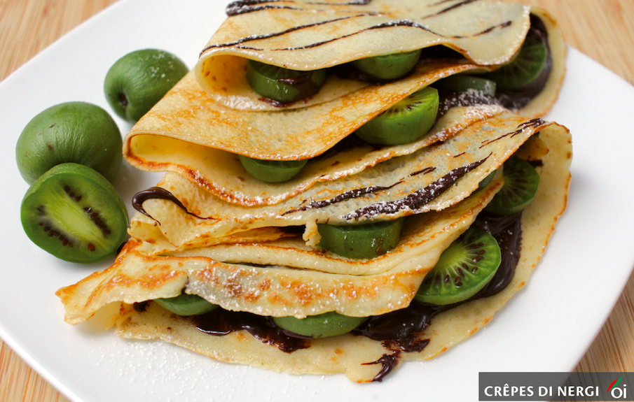 5. Spalmate la crema ottenuta sulle crêpes, quindi aggiungete i Nergi precedentemente lavati e tagliati a fette.
