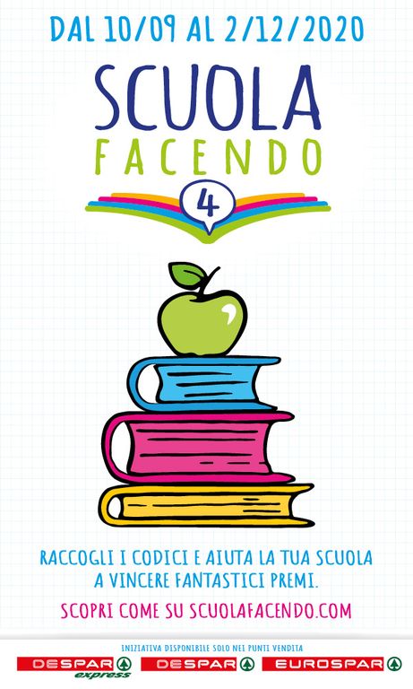 Fino al 2 dicembre 2020, attraverso il progetto Scuolafacendo i punti di vendita aderenti al Gruppo Despar Nordovest distribuiscono, in occasione della spesa, ai propri clienti dei codici scuola.