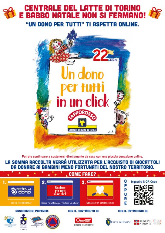 "Un Dono per Tutti", la maratona benefica da sempre voluta, organizzata e gestita dalla Centrale del Latte di Torino, l’azienda leader in Piemonte per la produzione e distribuzione di latte, e che coinvolge associazioni No Profit, vira al digitale nell’anno della sua XXII edizione. Parte, con la prima simbolica donazione di duemila euro da parte dell’azienda, un crowdfunding via web per la raccolta benefica. Nato dalla volontà dell’azienda di rendere più piacevole il periodo natalizio anche ai bambini meno fortunati, “Un Dono per tutti” ha coinvolto negli anni il pubblico torinese e le famiglie piemontesi più sensibili che partecipavano alla raccolta di doni e giochi, poi ridistribuiti attraverso le più attive associazioni del territorio (come la Protezione Civile, l’U.G.I. Unione Genitori Italia, Forma Onlus, Sermig).