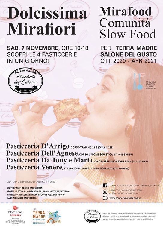 Richiamando golosamente il superlativo che caratterizza i principali eventi del mese dell'arte contemporanea a Torino, la periferia sud della città mette in scena, sabato 7 novembre, dalle ore 10 alle ore 18, “Dolcissima Mirafiori”, per Terra Madre Salone del Gusto. Un tour libero alla scoperta del quartiere e del suo dolce tipico, "Il Tronchetto di Caterina", vincitore del contest promosso diversi mesi fa dal progetto COM.PRO a Mirafiori, con il sostegno della Fondazione della Comunità di Mirafiori Onlus e l’accompagnamento di Kallipolis.
