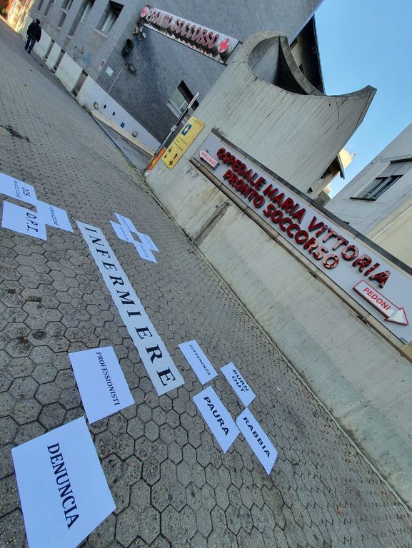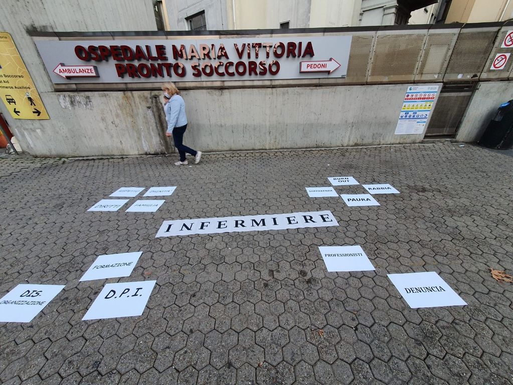 Protesta silenziosa e pacifica, nel pomeriggio di oggi a Torino, davanti all'ospedale Maria Vittoria da parte di alcuni degli infermieri professionali che lavorano in quella struttura.