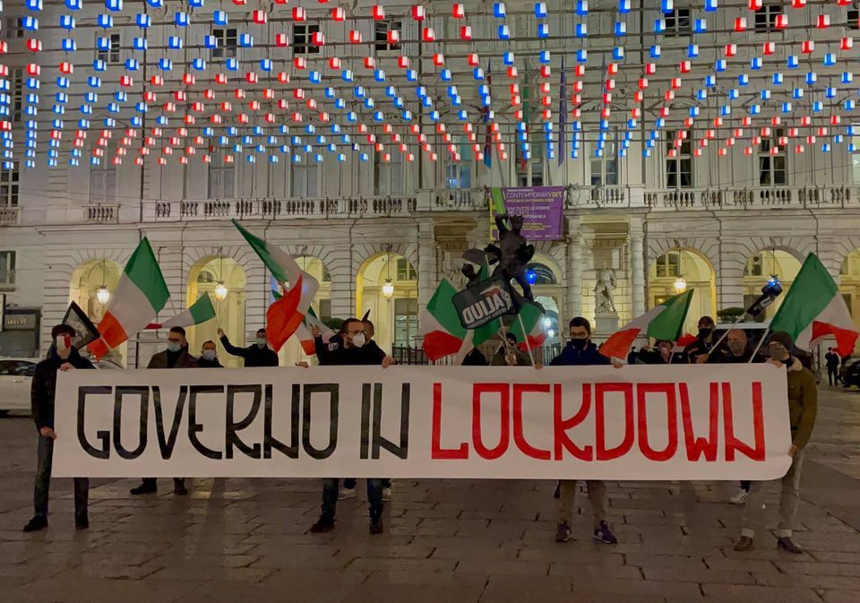 Una trentina di militanti di Aliud - Destra Identitaria si sono dati appuntamento, ieri sera, sotto il Comune di Torino per contestare il lockdown regionale imposto dal governo. "Governo in Lockdown" recita lo striscione aperto dai militanti, che al termine del presidio hanno riprodotto il Tricolore con i fumogeni.