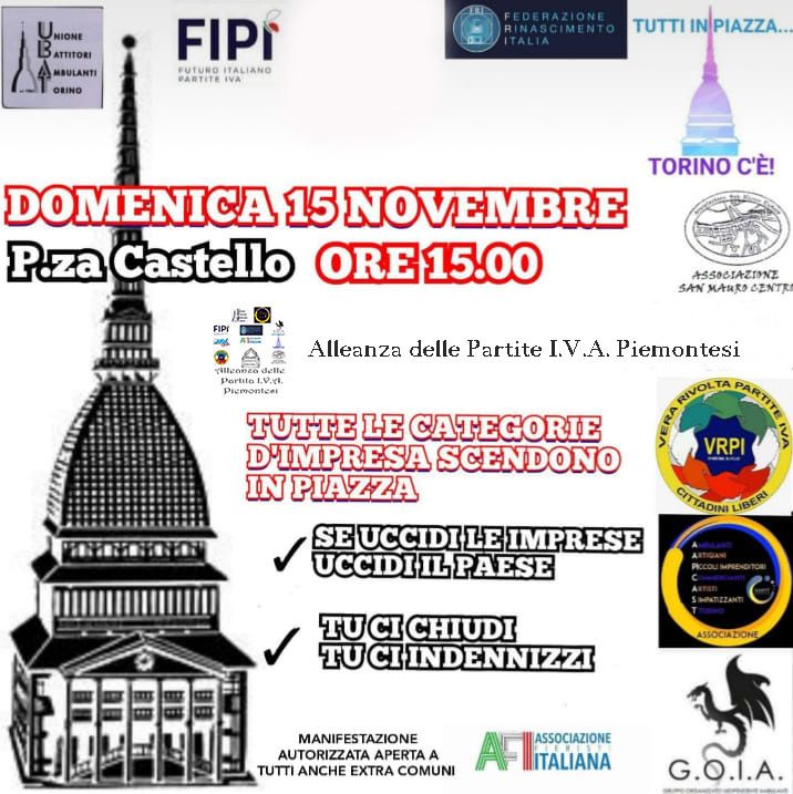 All’appuntamento di domenica 15 novembre, alle ore 15, in piazza Castello a Torino, saranno presenti numerose sigle, sotto il ‘cartello’ dell’Alleanza Partite Iva, a rappresentare i comparti lavorativi maggiormente penalizzati: