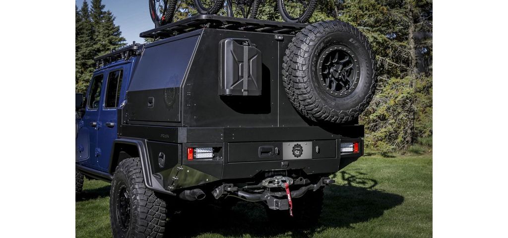 Un secondo verricello Warn JPP è installato sulla parte posteriore del Jeep Gladiator Top Dog Concept. Appena al di sopra del verricello posteriore, un cassetto estraibile contiene una scaletta pieghevole che facilita l’accesso al doppio portabici.
