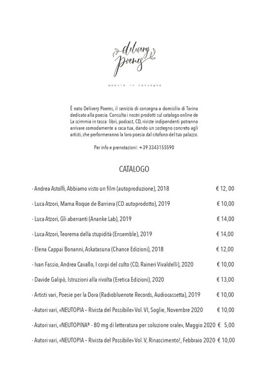 Nato all'inizio di settembre, dopo aver ospitato diverse performance e mostre di artisti indipendenti, è stato costretto, come tutti gli altri spazi analoghi, a chiudere temporaneamente i battenti. Da qui, la geniale trovata di portare direttamente nelle abitazioni dei torinesi libri di poeti locali, offerti in un comodo catalogo consultabile a mo' di menù. Ma non solo: gli autori scelti si presteranno anche a una lettura delle proprie composizioni direttamente al citofono del destinatario, mantenendo quindi il distanziamento fisico, ma annullando quello tra le anime più sensibili, che ancora hanno voglia di purezza lirica.