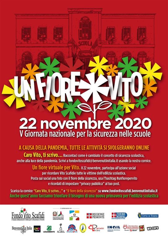 Il 22 di novembre, la Fondazione Benvenuti in Italia – Fondo Vito Scafidi, insieme ad ACMOS, Libera Piemonte e tutta la rete nazionale del WeCare, celebra la Giornata Nazionale per la Sicurezza nelle Scuole per la quinta volta, da quando nel 2015, il Parlamento ha stabilito tale data come giorno di memoria delle vittime dell’edilizia scolastica e impegno per la diffusione della cultura della sicurezza tra i più giovani. Tale ricorrenza è stata istituita nell’anniversario morte del giovane Vito Scafidi, che perse la vita il 22 novembre del 2008 a Rivoli, a causa del crollo del controsoffitto della sua aula.