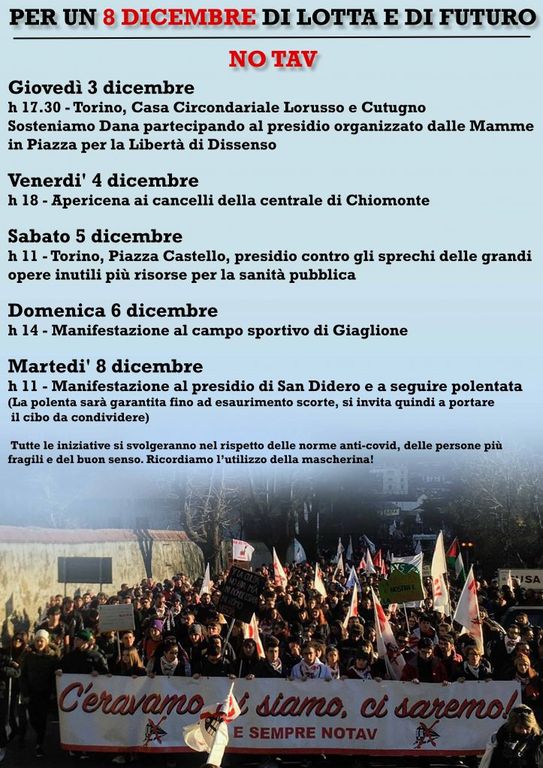 Ma sono diverse le azioni in programma, ad iniziare giovedì 3 dicembre, con il presidio all'esterno del carcere delle Vallette per chiedere la liberazione della portavoce Dana Lauriola, poi altra manifestazione sabato mattina in piazza Castello per dire "no alle opere inutili", prologo di quella domenica 6, alle ore 11, al campo sportivo di Giaglione. "E’ passato un anno e molte cose sono successe. La pandemia ancora in corso di covid-19, gli insulsi e falliti tentativi di allargamento del cantiere di Chiomonte, gli splendenti e ritrovati mulini della val Clarea ed un’intensa estate di lotta", scrivono su notav.info i manifestanti.