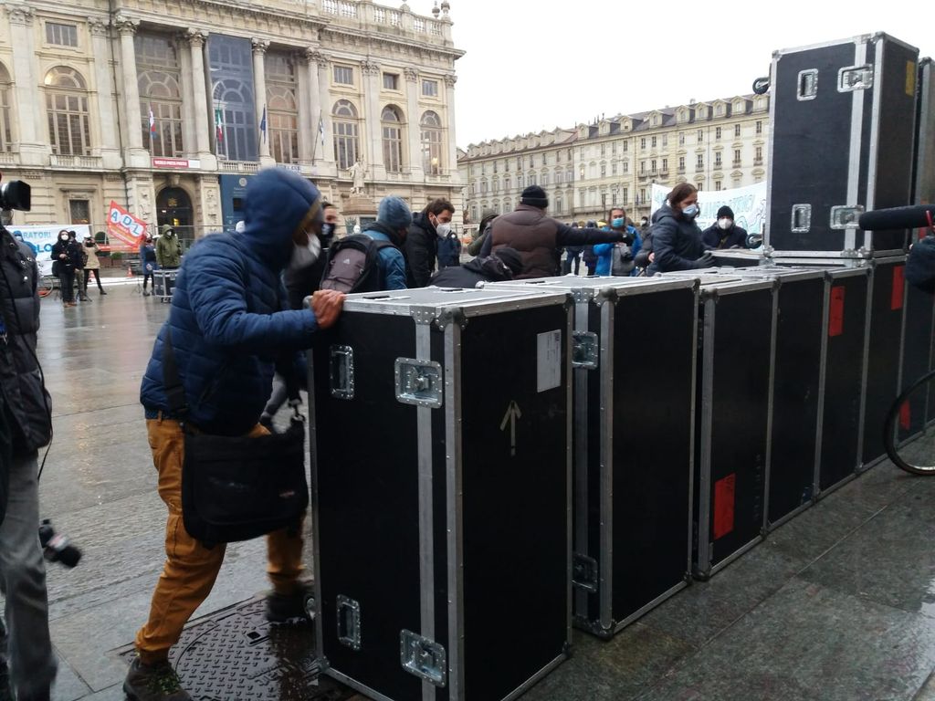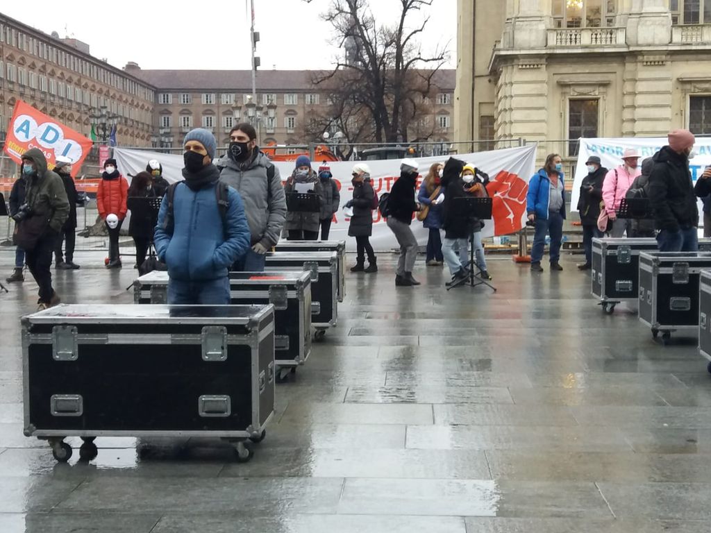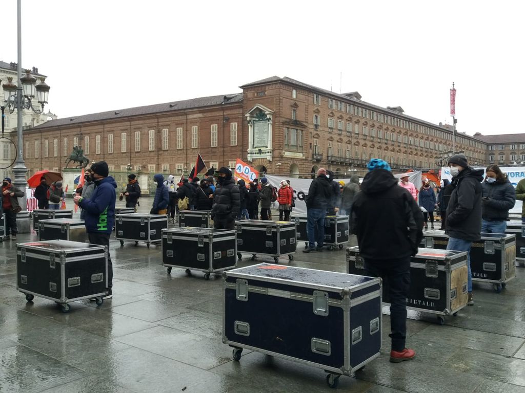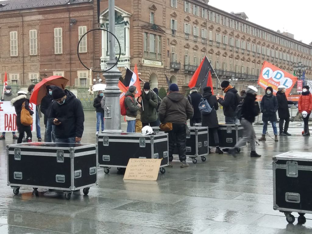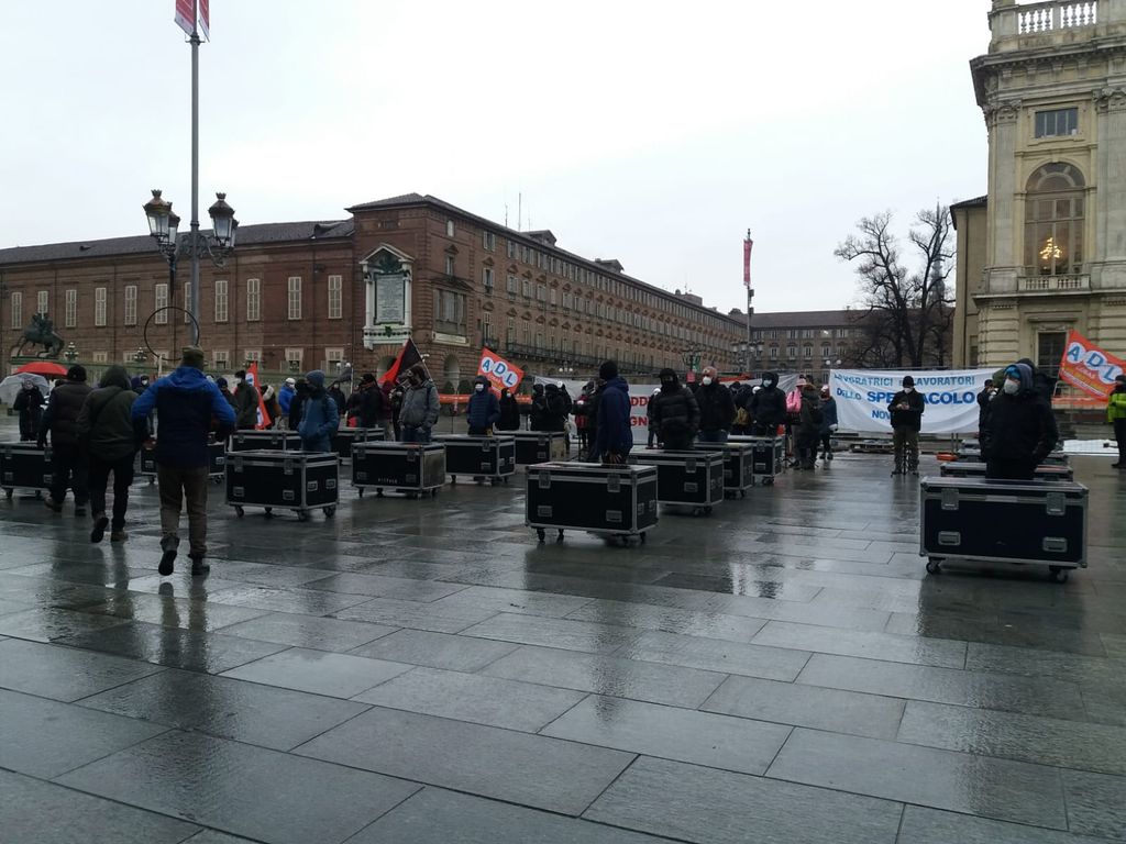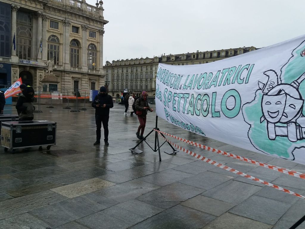 Il maltempo non ha bloccato la manifestazione indetta dal coordinamento dei Lavoratori dello spettacolo in Piemonte, oggi pomeriggio in piazza Castello, a Torino.