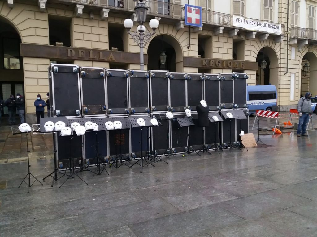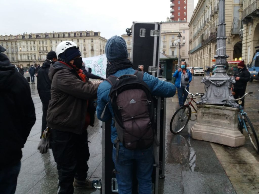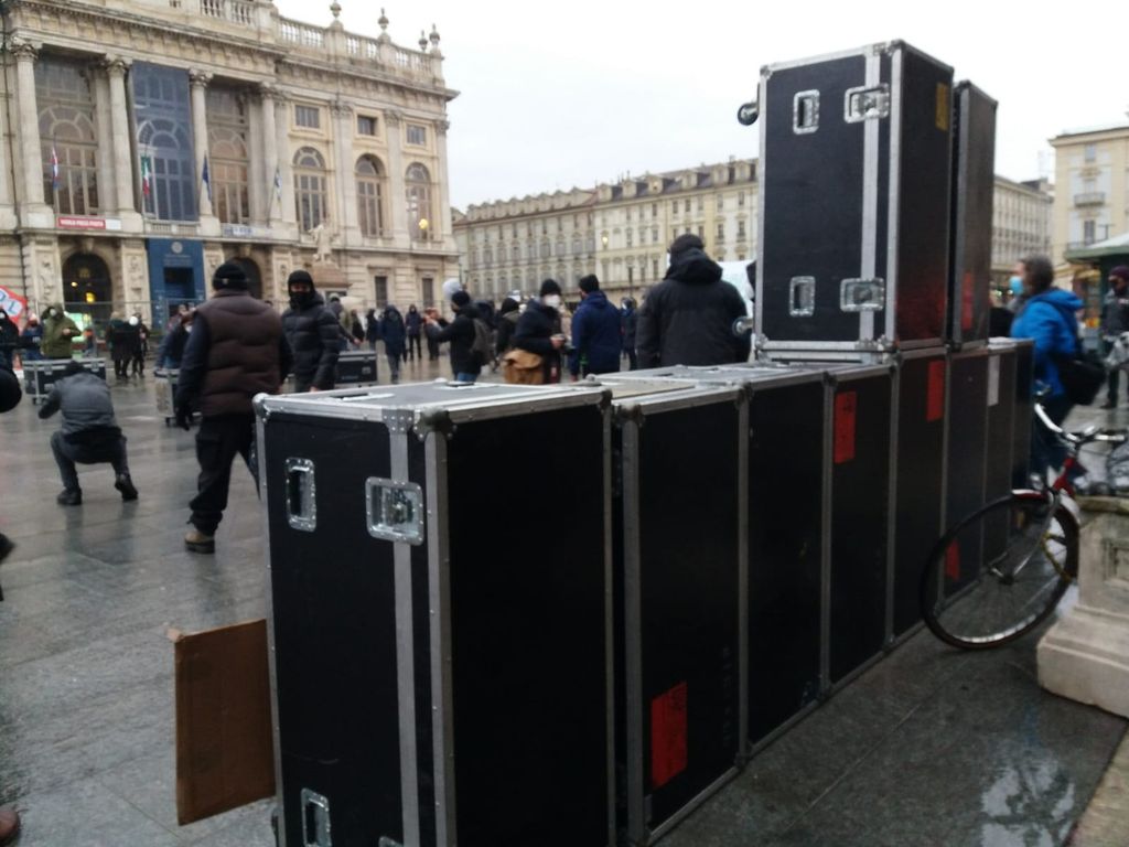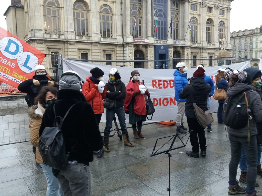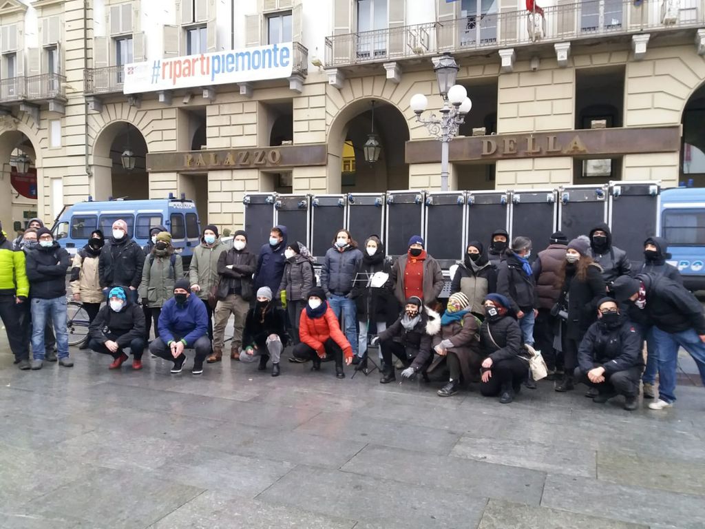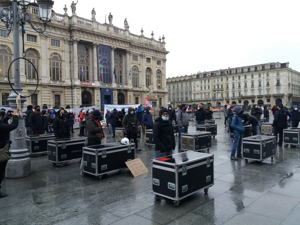 Il maltempo non ha bloccato la manifestazione indetta dal coordinamento dei Lavoratori dello spettacolo in Piemonte, oggi pomeriggio in piazza Castello, a Torino.