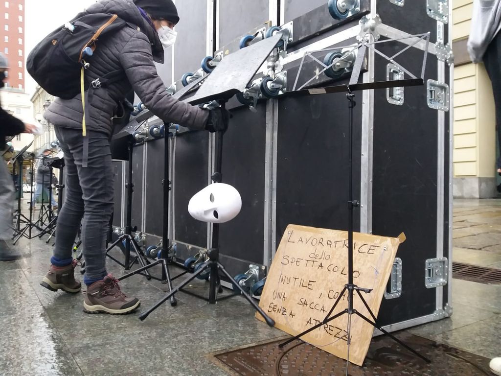 Un centinaio al flash-mob organizzato dal coordinamento piemontese delle maestranze: "Sosteniamo piccoli teatri e piccole compagnie sul territorio"