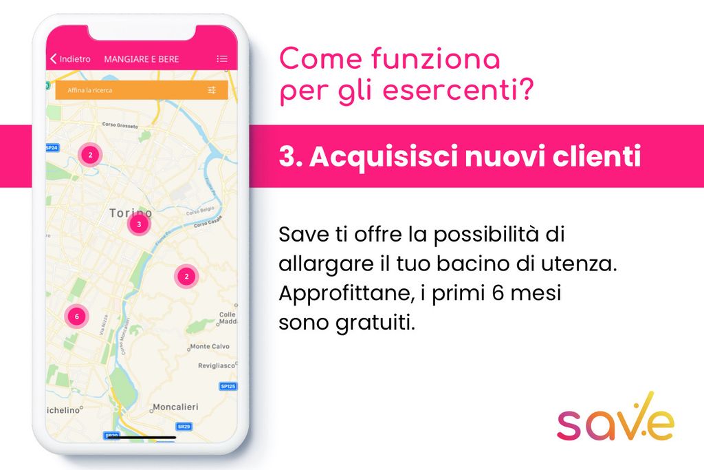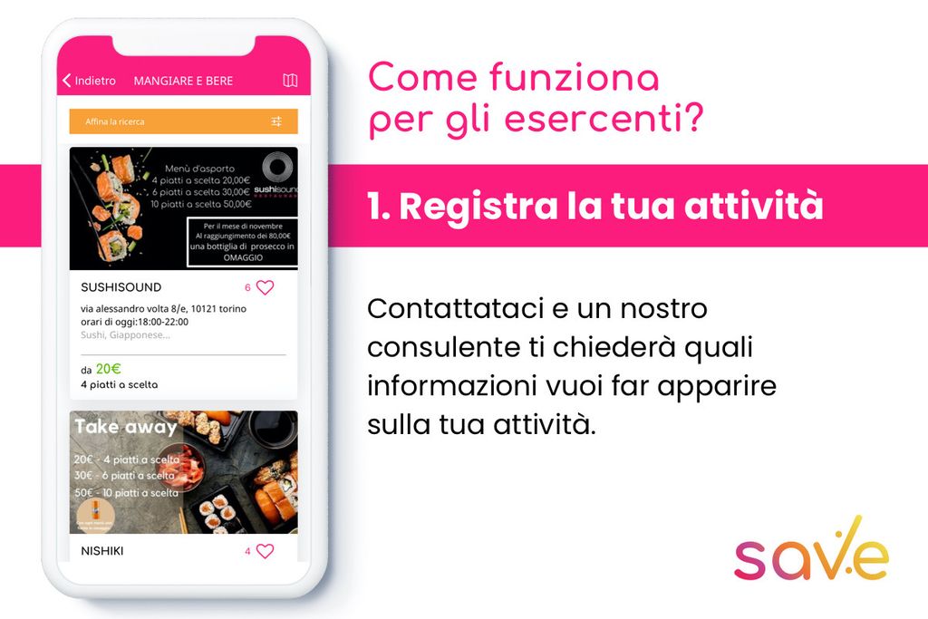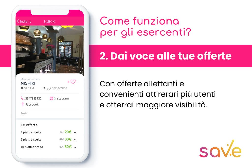 “Chi è proprietario o gestisce un negozio e vuole iniziare a promuove la propria attività su Save app può facilmente registrarsi al portale inserendo dati, immagini e promozioni. L’iscrizione all’app è totalmente gratuita per i primi 6 mesi e poi, allo scadere della prova, l'utente potrà scegliere se continuare o no a soli 5,90 € al mese, inoltre non ci saranno commissioni. Mentre per chi accederà all'app per trovare l'offerta migliore, il servizio sarà sempre gratuito. Scaricando l’app potrà scegliere la promozione che più preferisce. L’uso poi è facilissimo, infatti, all'utilizzatore basterà mostrare l’offerta al locale e lo sconto verrà applicato subito”.