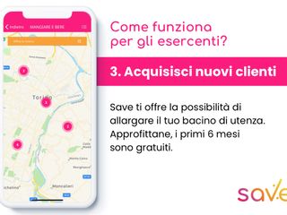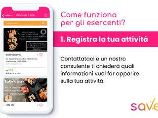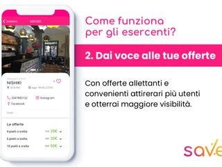 “Chi è proprietario o gestisce un negozio e vuole iniziare a promuove la propria attività su Save app può facilmente registrarsi al portale inserendo dati, immagini e promozioni. L’iscrizione all’app è totalmente gratuita per i primi 6 mesi e poi, allo scadere della prova, l'utente potrà scegliere se continuare o no a soli 5,90 € al mese, inoltre non ci saranno commissioni. Mentre per chi accederà all'app per trovare l'offerta migliore, il servizio sarà sempre gratuito. Scaricando l’app potrà scegliere la promozione che più preferisce. L’uso poi è facilissimo, infatti, all'utilizzatore basterà mostrare l’offerta al locale e lo sconto verrà applicato subito”.