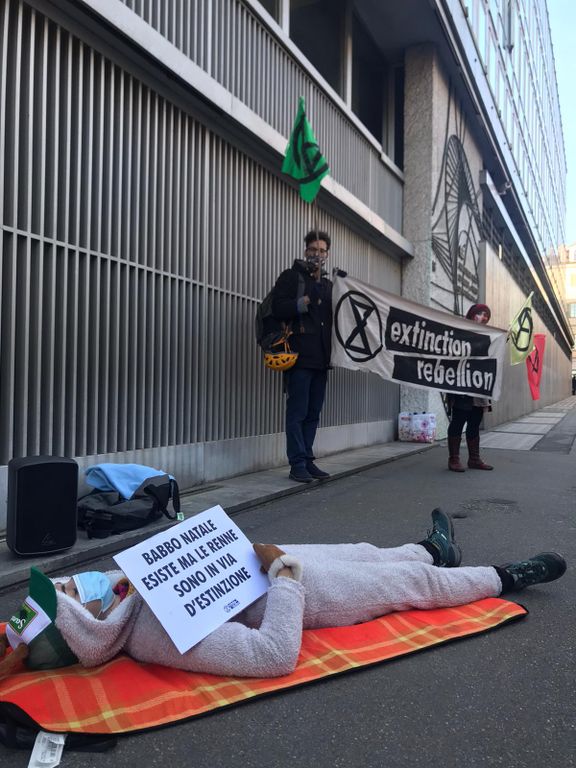 Flash mob di Extinction Rebellion Torino: Babbo Natale, accompagnato da una renna, ha portato pacchi regalo tematici davanti alla sede della televisione pubblica